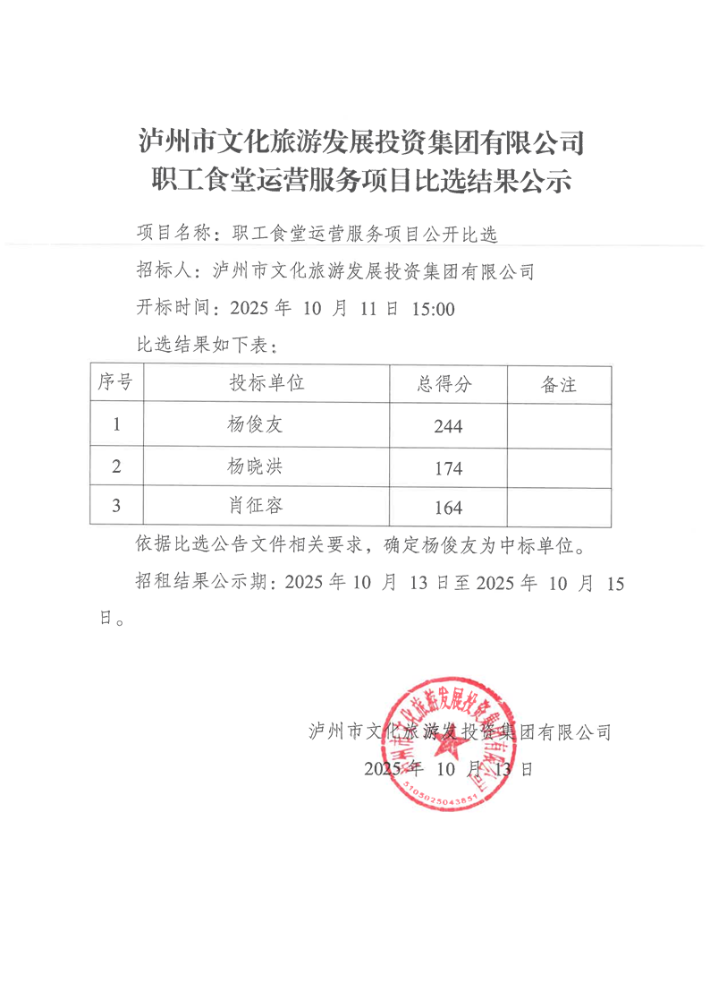 瀘州市文化旅游發(fā)展投資集團(tuán)有限公司職工食堂運(yùn)營服務(wù)項(xiàng)目比選結(jié)果公示 作者: 來源: 日期:2025-10-13 瀏覽次數(shù): 次 【字體:小 大】 【打印正文】